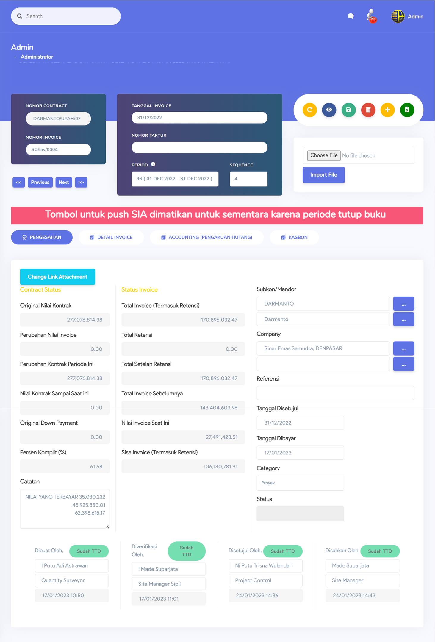 Invoice Contract adalah pencatatan untuk transaksi biaya berdasarkan progress pekerjaan yang mengacu form Contract Mandor / Subcon yang dibuat sebelumnya.